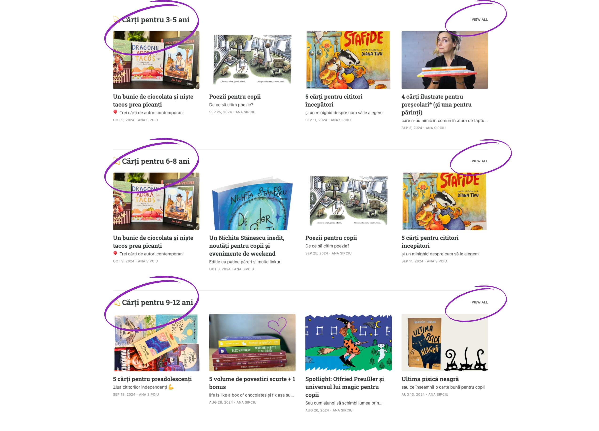 Eu una consider recomandările pe vârste ceva orientativ, pentru că am văzut și copii de 5-6 ani care au răbdare pentru romane lungi pe capitole, dar și copii de 7-8 ani care încă iubesc cărțile ilustrate. Deci uitați-vă mai degrabă la obiceiurile, preferințele și nivelul fiecărui copilaș în parte, nu doar la ce spune editura (sau eu 🤷♀️). Însă, dacă aveți nevoie de un ghidaj, am reorganizat și site-ul pe secțiuni (scroll down ca să le vedeți), care deocamdată sunt un pic amestecate - pentru că până acum am amestecat și eu recomandările -, dar încet-încet vor deveni mai clar separate.