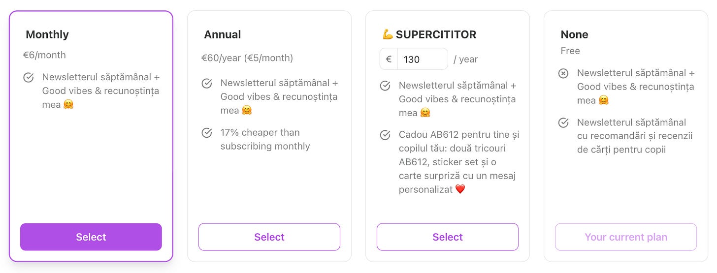 În plus - foarte important -, la nivel de valori personale, eu cred în a plăti pentru ceea ce primești. Eu însămi sunt abonată la diverse newslettere, platforme de presă sau creatori de conținut pe care vreau să îi susțin pentru că apreciez munca lor, chiar dacă în unele cazuri sunt ”doar” eseuri personale.